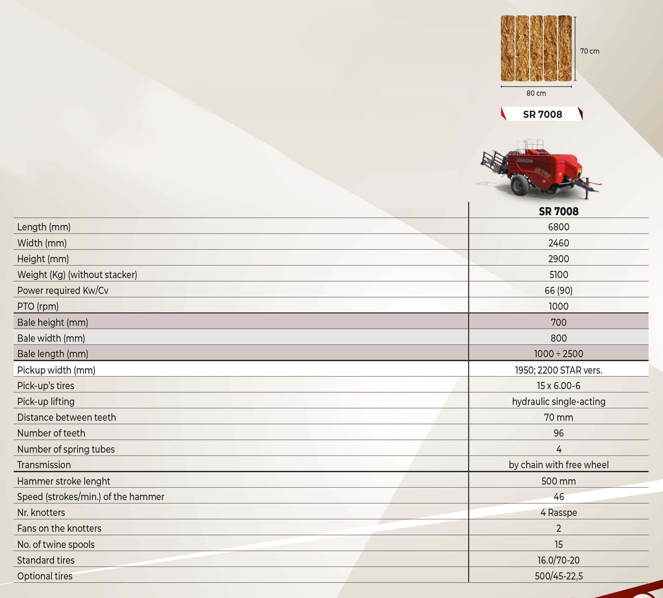The SR 7008 also adopts a pre-chamber system that allows for well-formed bales with uniform density even in the case of small windrows.