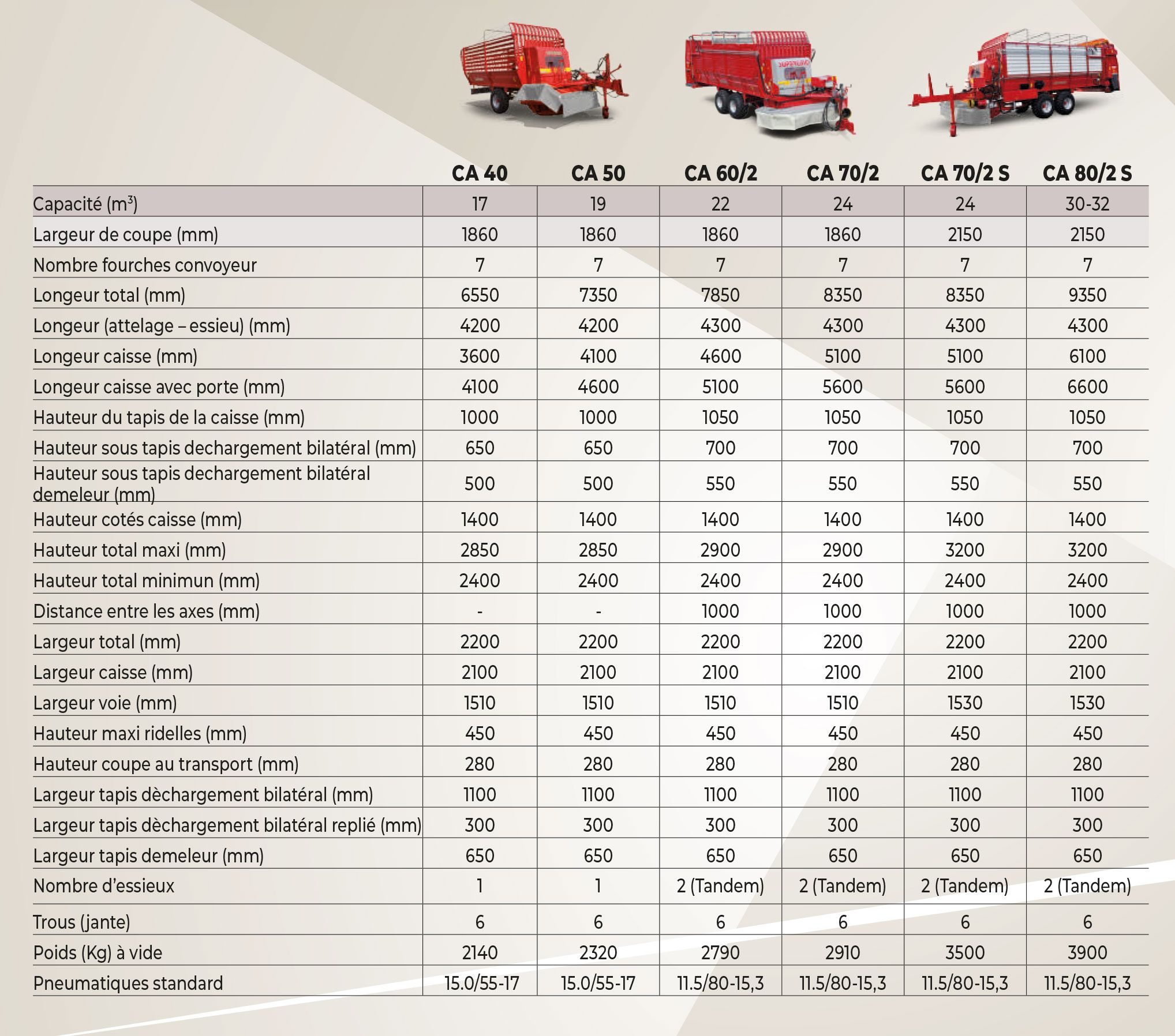 Les modèles CA 40 - CA50 - CA60 - CA70 - CA70S-CA80S, avec attelage tracteur au-dessus de la prise de force, sont équipés de série d'un tapis de chargement hydraulique et d'un tapis de déchargement à vitesse variable.