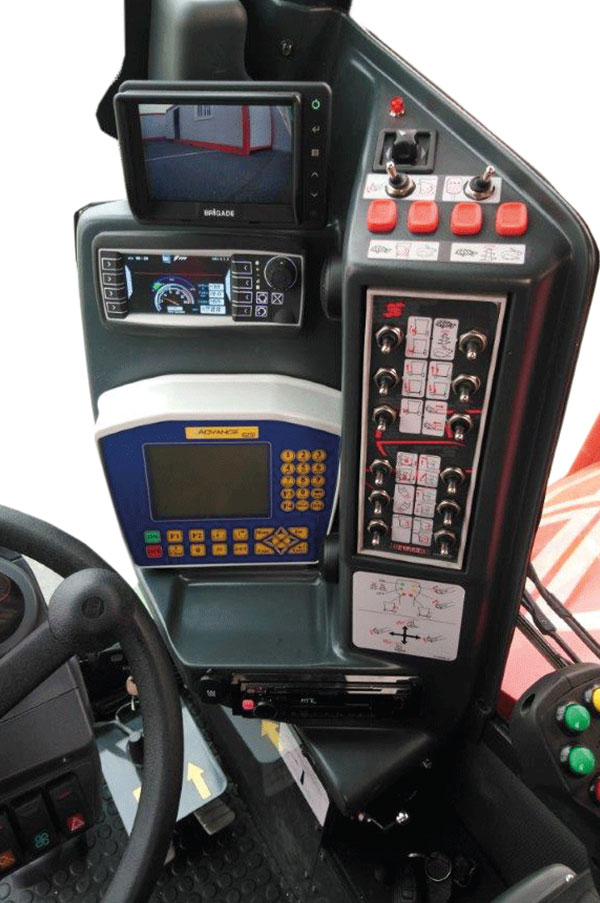 La cabina, dislocata sul lato sinistro della macchina assicura una buona visibilità e un buon comfort. Il joystick posizionato sulla destra dell’operatore raggruppa i principali comandi, come la rotazione della fresa, il sollevamento del braccio, l’inserimento e il disinserimento delle coclee e dei contra-coltelli, l’apertura e la chiusura del tappeto di scarico.