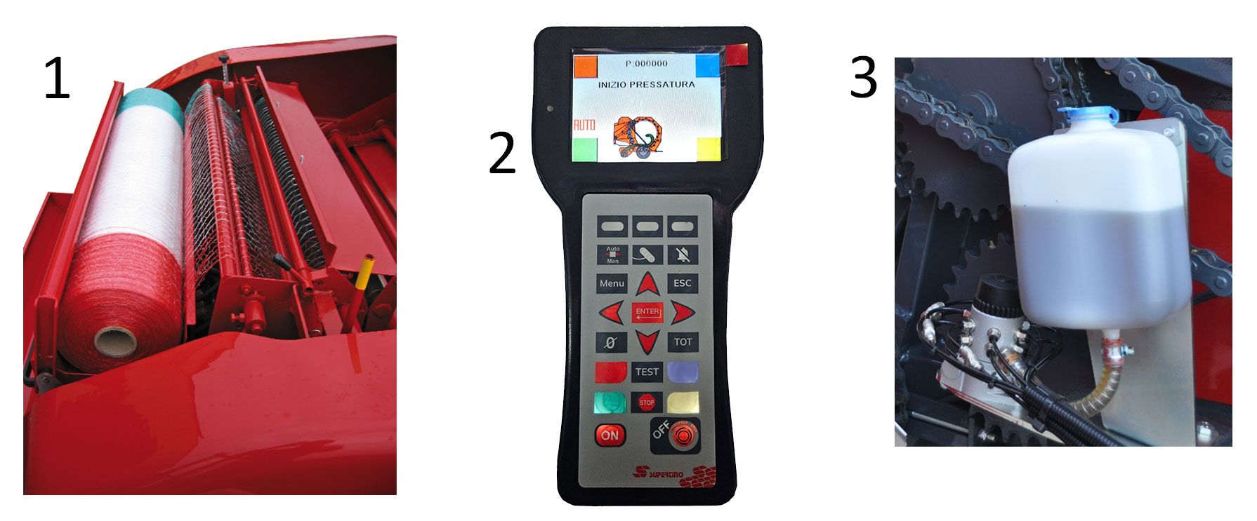 Questo tipo di legatore non necessita dell’avanzamento della trattrice per il suo avvio: a pressione raggiunta e all’arresto dell’avanzamento, si può avviare la legatura. Si ha quindi la garanzia di avvolgimento balla sulla totalità della larghezza. - La centralina di bordo permette le funzioni di: