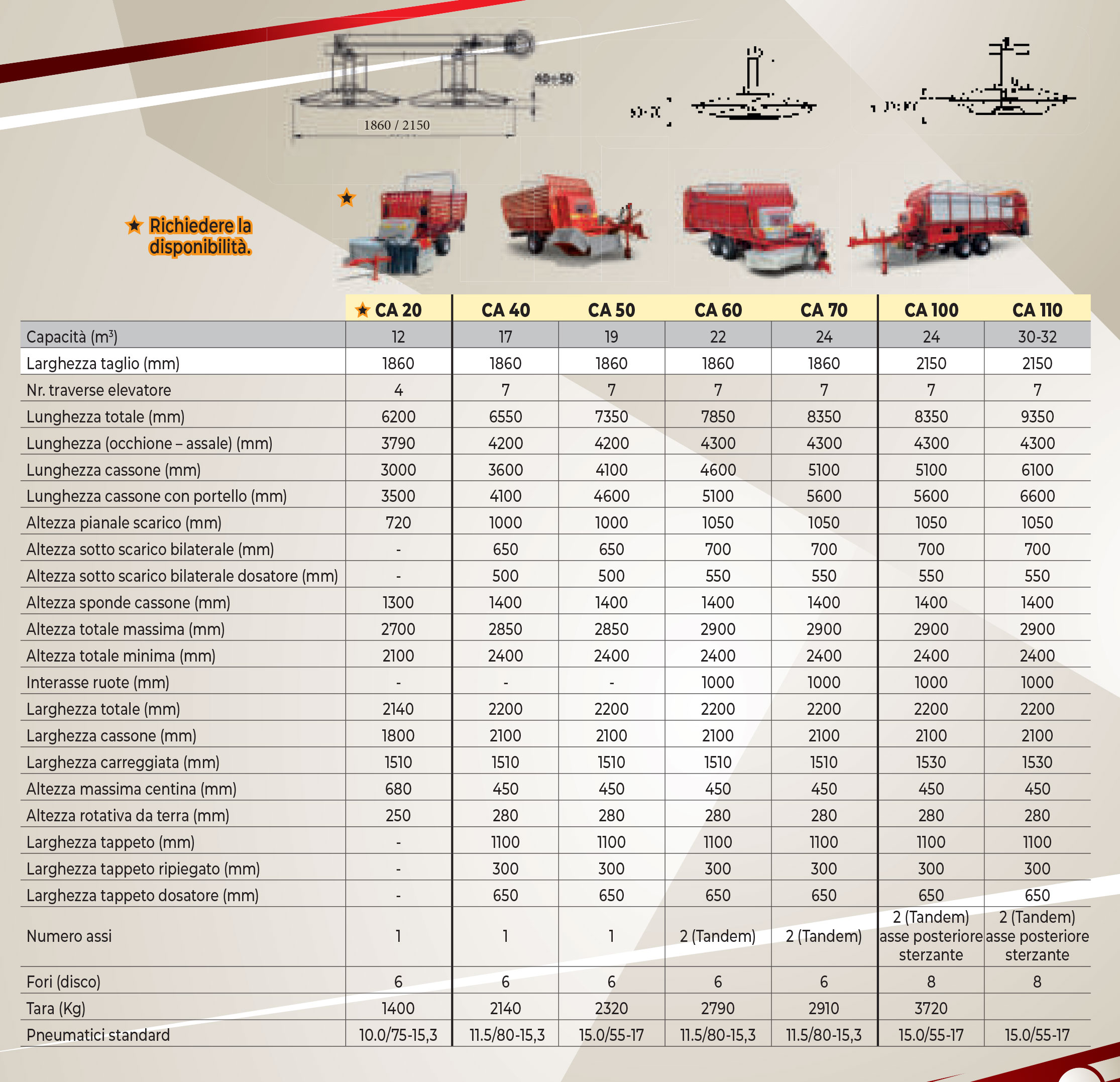 I modelli CA 40 - CA50 - CA60 - CA70 con aggancio alla trattrice sopra la presa di forza sono equipaggiate di serie di un convogliatore di carico idraulico e di un tappeto di scarico che può essere a velocità variabile.